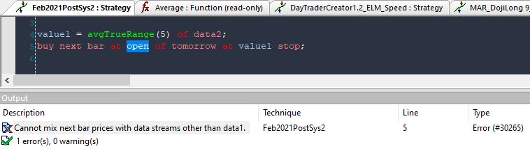 if d <> d[1] then value1 = .2 * average(Range of data2,5); value2 = value1 * 5; if t > sess1startTime then buy next bar at opend(0) + value1 stop; setProfitTarget(value2*bigPointValue); setStopLoss(value2/2*bigPointValue); setExitOnClose;