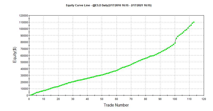 While playing around with this I did some prototyping of a daily bar system and created this equity curve. I mistakenly did not allow any losses – only took profits and re-entered long.