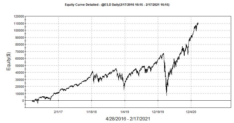 All this code because I couldn’t sneak a peek at the date of tomorrow. Here are the results of trading the ES futures sans execution costs for the past 15 years.