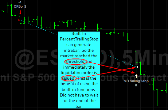 The trailing stop had to wait for the bar to complete to determine if the profit reached the threshold. A little slippage here. You can overcome this if you use the BuiltIn Percent Trailing Strategy or by using the SetPercentTrailing function call.