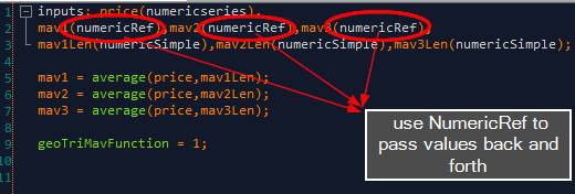 Here I am modifying mav1, mav2 and mav3 within the function and then passing the values back to the calling strategy/indicator/paintbar. All functions must return a value so I simply assign the value 1 to the function name. The key here is the keyword numericRef, once I change the values located in the addresses of mav1, mav2 and mav3 (address are provided by the keyword numericRef), they will be made available to the calling program. This code allows the function to return more than just one value.