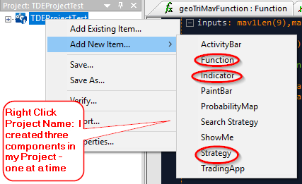 Here is simple Project with three components: indicator, function, and strategy.