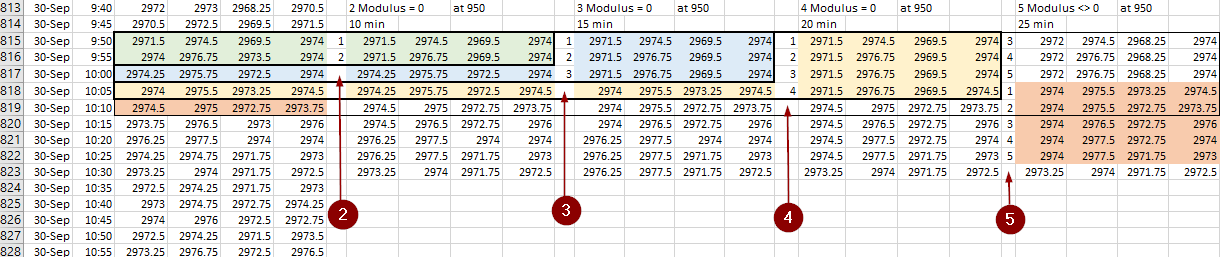 Because I use BarNumber in my MODULUS calculation the different time frames that I keep track of may not align with the time frames on the chart; your 10-minute bar O, H, L, and C values may not align with the values I am storing in my 10-minute bar container. Take a look at this snapshot of a spreadsheet.